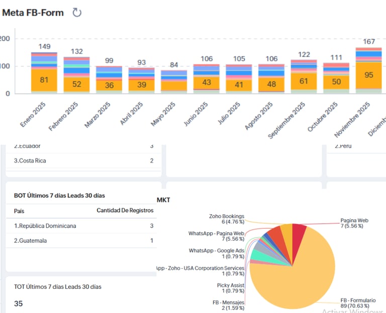 Tenemos 4 cosas cumplidas en este proyecto: 1. El 70.63% de las ventas son de campañas de formulario. 2. De las ventas de formulario de 0 a 7 días generó compras casi inmediatas al momento de registrarse en el formulario de campañas publicitarias. 3. Batimos record de ventas en el mes de noviembre de 2025 desde que la empresa fue fundada. 4. Campañas de formulario para captar clientes de Empresariales de habla Hispana en el continente americano y España.